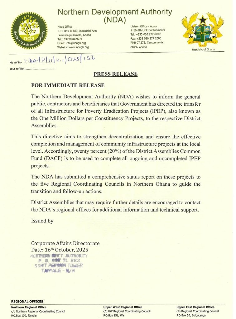 The Northern Development Authority (NDA) has announced that all Infrastructure for Poverty Eradication Projects (IPEP), also known as the One Million Dollars per Constituency Projects, have been officially transferred to the respective District Assemblies across Northern Ghana.