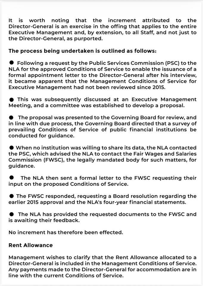 On claims regarding rent allowance, the NLA stated that such benefits are part of the established conditions of service for the Director-General and have been consistently granted to previous officeholders. It also dismissed reports that the Director-General receives annual rent payments of $108,000 or $228,000 as false.