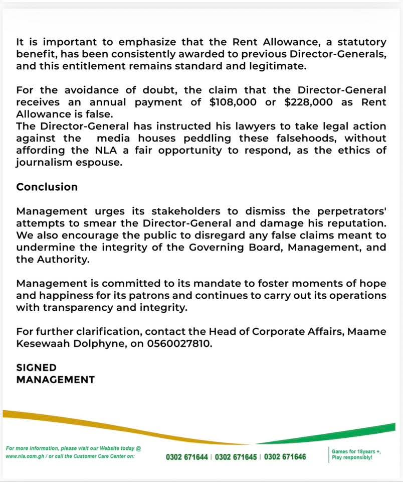 These adjustments, it said, have already taken effect.The NLA also rejected claims that the Director-General’s salary had been increased from GHS 38,000 to GHS 70,000. It emphasized that the Director-General does not have the authority to unilaterally adjust his own salary, noting that such decisions are subject to formal approval processes involving the Governing Board and relevant state institutions.